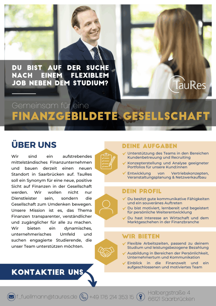 Wir sind ein aufstrebendes mittelständisches Finanzunternehmen und bauen derzeit einen neuen Standort in Saarbrücken auf. TauRes soll ein Synonym für eine neue, positive Sicht auf Finanzen in der Gesellschaft werden. Wir wollen nicht nur Dienstleister sein, sondern die Gesellschaft zum Umdenken bewegen. Unsere Mission ist es, das Thema Finanzen transparenter, verständlicher und zugänglicher für alle zu machen. Wir bieten ein dynamisches, unternehmerisches Umfeld und suchen engagierte Studierende, die unser Team unterstützen möchten.