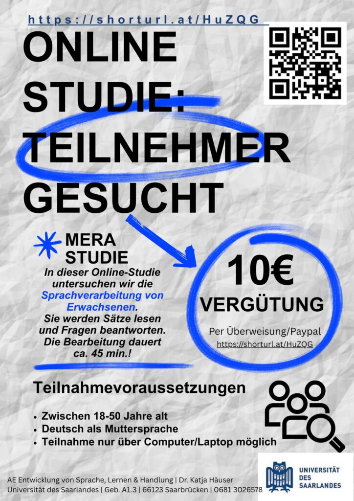 Für eine Projektarbeit in Psychologie von der Uni Saarbrücken suchen wir Versuchspersonen für eine Online-Studie auf dem Laptop.