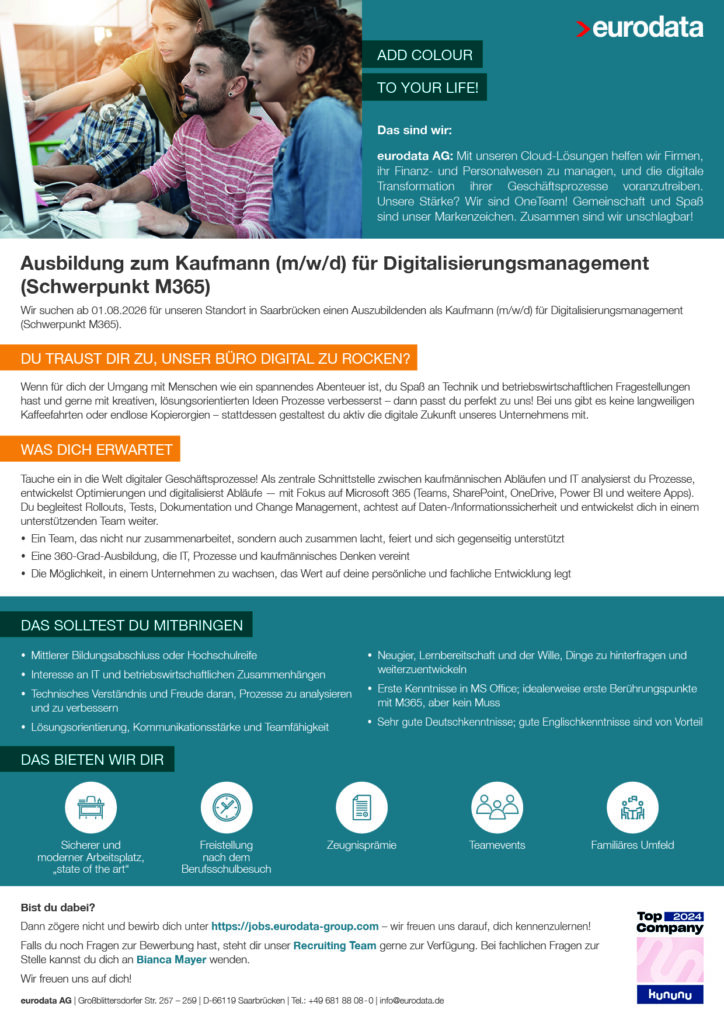 Wir suchen ab 01.08.2026 einen Azubi als Kaufmann (m/w/d) für Digitalisierungsmanagement (Schwerpunkt M365) – lass uns reden, wenn du früher einsteigen möchtest!