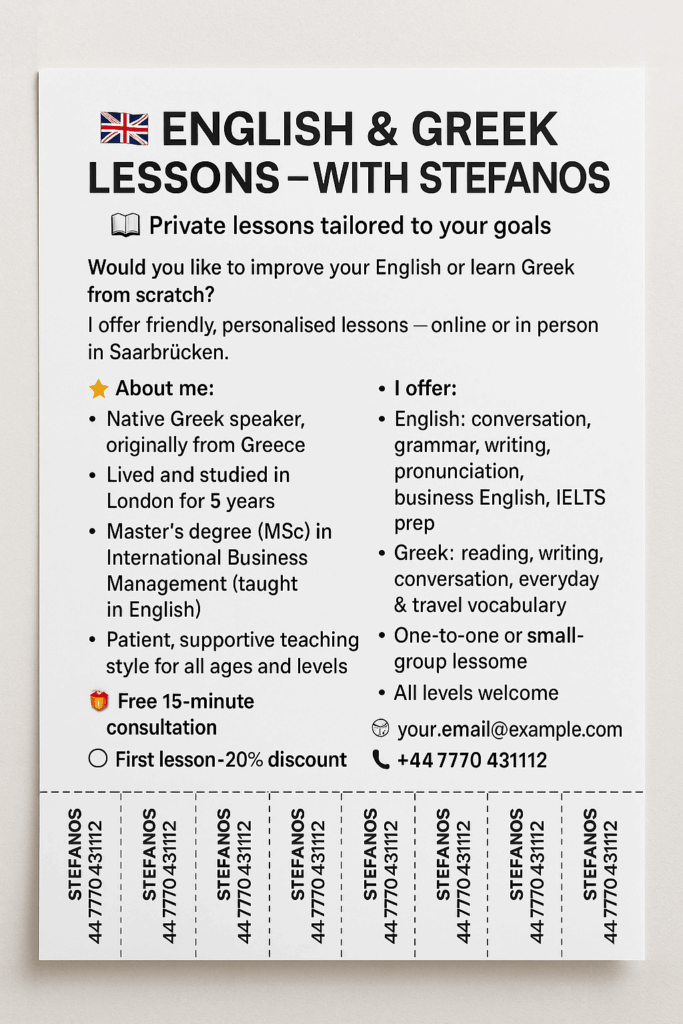 I offer private English and Greek lessons tailored to your needs – whether you’re a complete beginner, a student, or a professional looking to enhance your communication skills.