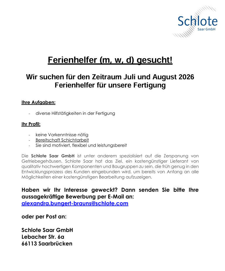 Die Schlote Saar GmbH ist unter anderem spezialisiert auf die Zerspanung von Getriebegehäusen. Schlote Saar hat das Ziel, ein kostengünstiger Lieferant von qualitativ hochwertigen Komponenten und Baugruppen zu sein, die früh genug in den Entwicklungsprozess des Kunden eingebunden wird, um bereits von Anfang an alle Möglichkeiten einer kostengünstigen Bearbeitung aufzuzeigen.
