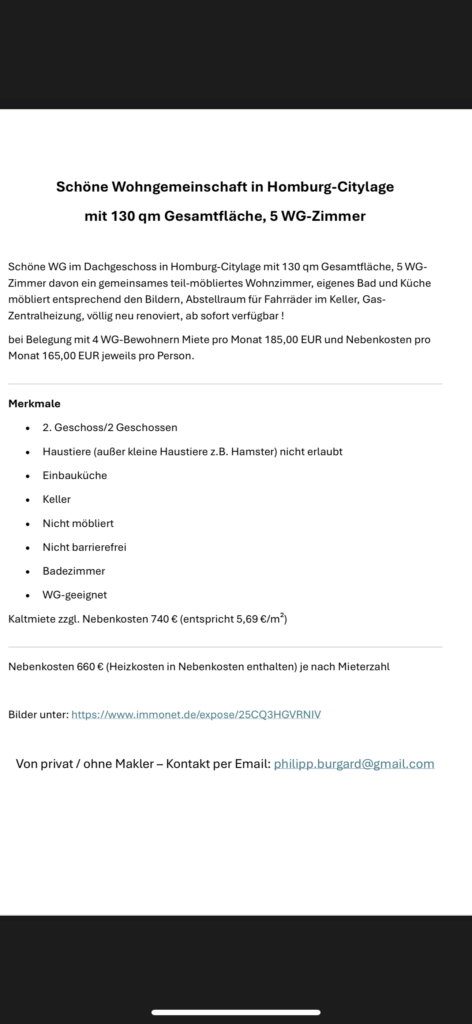 bei Belegung mit 4 WG-Bewohnern Miete pro Monat 185,00 EUR und Nebenkosten pro Monat 165,00 EUR jeweils pro Person.