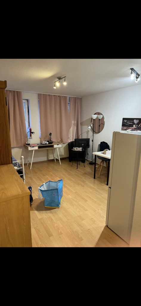 Es handelt sich um ein 22-23 m2 großes, möbliertes Studio-Apartment (1 Zimmer mit Küche und Bad) in der 1. Etage.