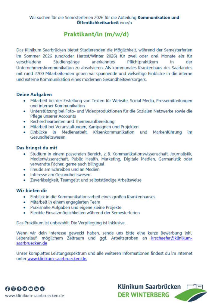 Das Klinikum Saarbrücken bietet Studierenden die Möglichkeit, während der Semesterferien im Sommer 2026 (und/oder Herbst/Winter 2026) für zwei oder drei Monate ein für verschiedene Studiengänge anerkanntes Pflichtpraktikum in der Unternehmenskommunikation zu absolvieren. Als kommunales Krankenhaus des Saarlandes mit rund 2700 Mitarbeitenden geben wir spannende und vielseitige Einblicke in die interne und externe Kommunikation eines modernen Gesundheitsversorgers.